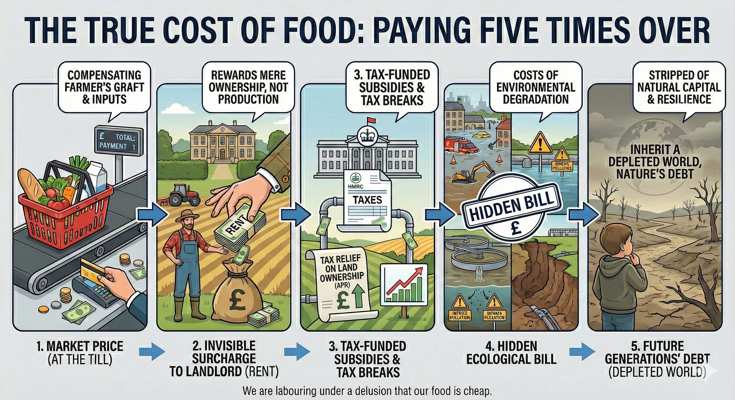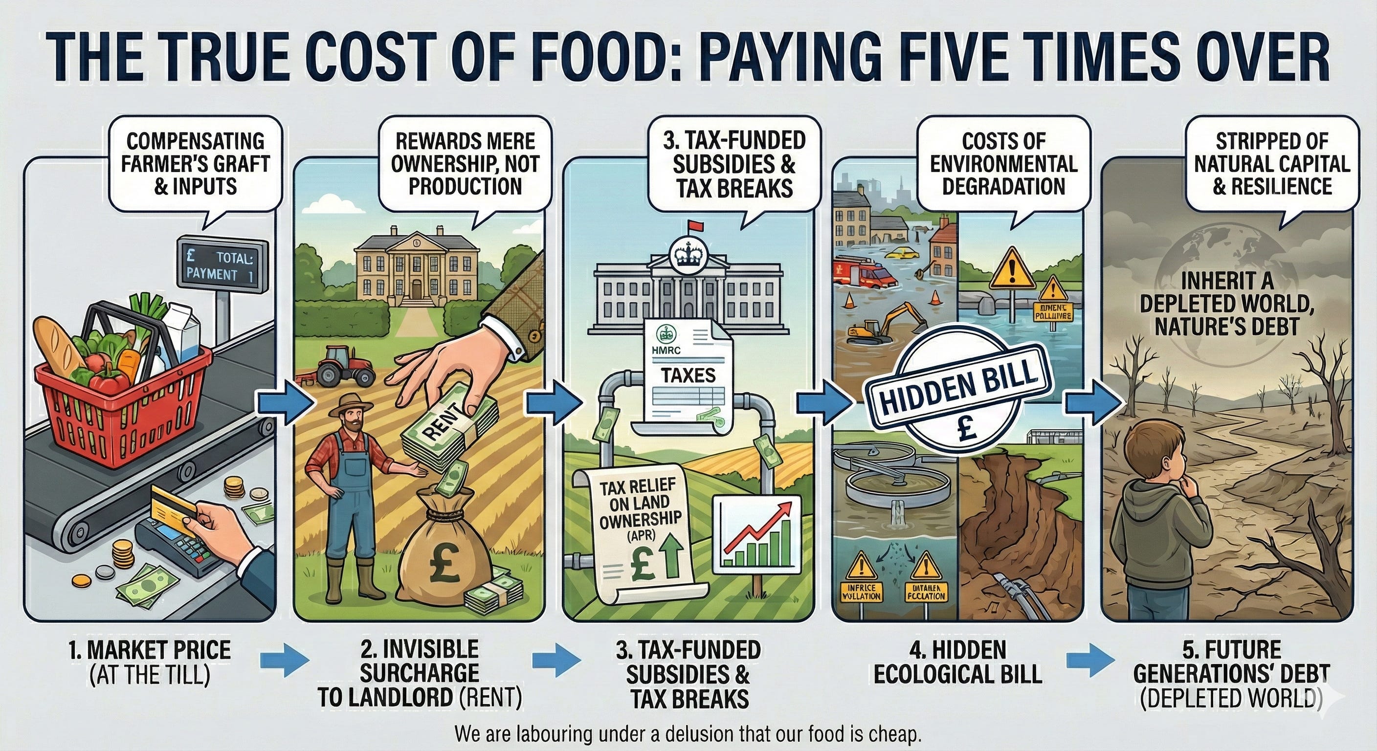 We are labouring under a delusion that our food is cheap when, in reality, we pay for it five times over. First, we pay the Cost of Production, compensating the farmer for their hard graft and inputs. Second, we pay an invisible surcharge to the landlord, as a significant portion of the farmer's revenue is siphoned off as rent, money that rewards mere ownership rather than production. Third, we pay through our taxes, funding subsidies that often prop up inefficient practices and inflate land values further. Fourth, we pay a hidden bill for ecological destruction; we cover the costs of protecting flooded towns, purifying nitrate-polluted water, and repairing infrastructure damaged by soil erosion, all consequences of forcing the land beyond its natural capacity. Finally, and most tragically, our children pay the fifth price: they inherit a depleted world, stripped of its natural capital, biodiversity, and climate resilience—a debt of nature that no amount of money can ever repay.