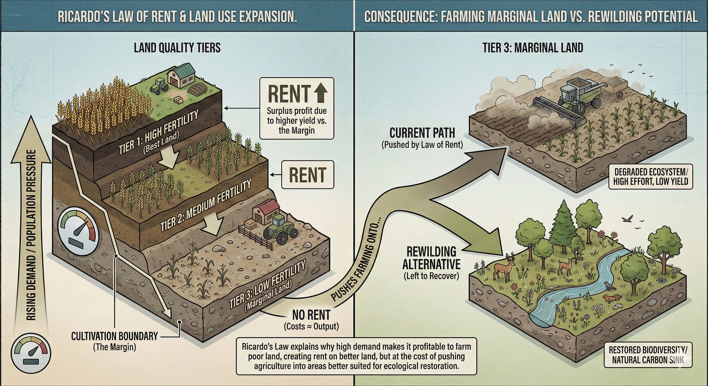 Ricardo’s Law of Rent explains the pressure to expand agriculture, but it is our choice of tax base that turns this pressure into destruction. By taxing labour and capital while subsidising land ownership and pollution, the UK has created a system that rewards speculation and environmental degradation.