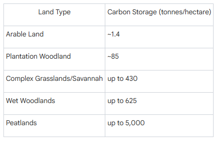 These figures reveal that our current land use is often the least effective at storing carbon. By shifting land from low-carbon uses like intensive agriculture to high-carbon habitats like wet woodlands and peatlands, we can pull enormous quantities of CO2 from the atmosphere.